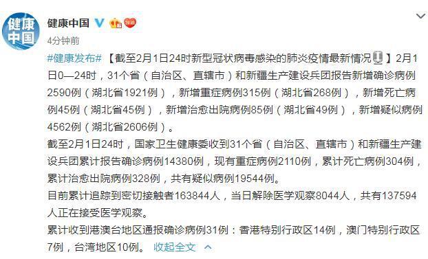 2月2日電 據(jù)國家衛(wèi)健委官方微博消息,2月1日0—24時(shí),31個(gè)省(自治區(qū)、直轄市)和新疆生產(chǎn)建設(shè)兵團(tuán)報(bào)告新增確診病例2590例(湖北省1921例),新增重癥病例315例(湖北省268例),新增死亡病例45例(湖北省45例),新增治愈出院病例85例(湖北省49例),新增疑似病例4562例(湖北省2606例)。